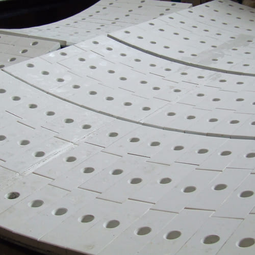 Pre-engineered alumina tiles are tailor made to suit any type of application such as short and long radius bends, small and large bore pipe sections, square to round transitions, cones, pipe junctions and connections etc. The ceramic tiles, when installed correctly, provide some resistance to low levels of shock and extreme sliding abrasion, caused by material passing over and wearing the surface of the part.