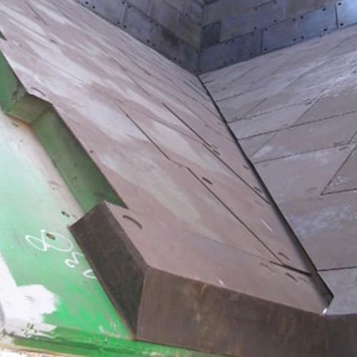 There are many applications where the material flow strikes the wear surface at sharp angles. This reduces the dampening effect of the rubber, resulting in increased rate of wear. Practice has shown that when lining material is profiled correctly, the material will impact on the rubber wear plate at a more favourable angle.